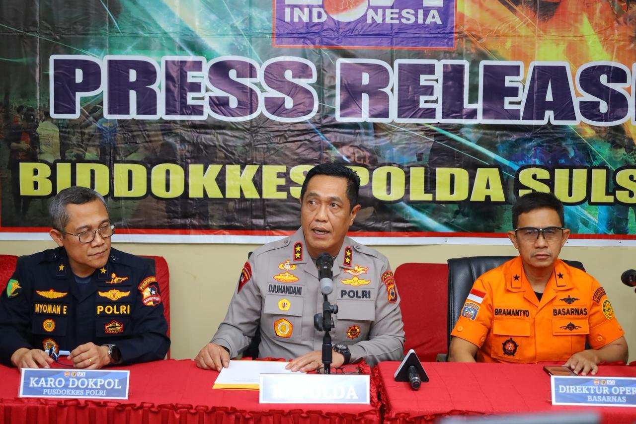 Konferensi pers dipimpin Kapolda Sulawesi Selatan Irjen Pol. Djuhandhani Rahardjo Puro, S.H., M.H., didampingi Karo Dokpol Pusdokkes Polri Brigjen Pol. dr. A. Nyoman Eddy Purnama Wirawan, DFM., Sp.F, Direktur Operasi Basarnas Laksamana Pertama TNI Yudhi Bramantyo, N.S., M.TR., Opsla, serta Kapusident Bareskrim Polri Brigjen Pol. Mashudi, S.I.K., S.H., M.Hum., Kabiddokkes Polda Sulsel Kombes Pol. dr. Muhammad Haris, M.A.R.S., QHIA.