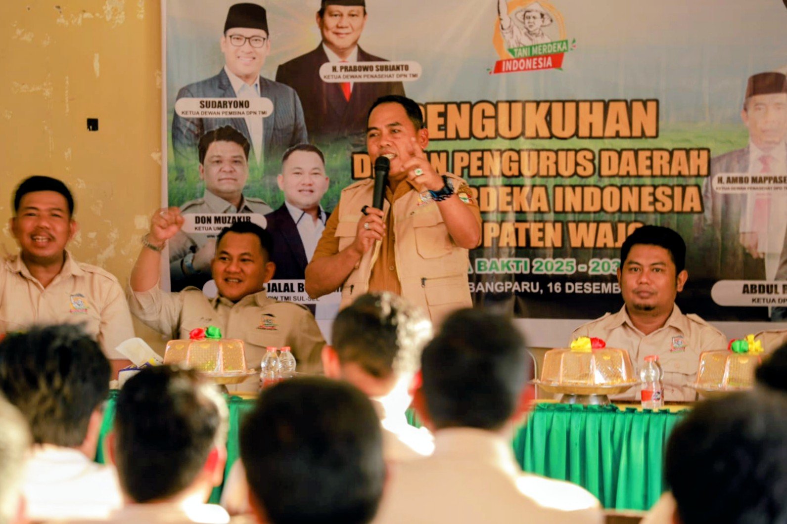 BugisPos, Wajo — Bupati Wajo, H. Andi Rosman, menghadiri pengukuhan pengurus Dewan Pimpinan Daerah (DPD) Tani Merdeka Indonesia (TMI) Kabupaten Wajo yang digelar di Aula Kantor Desa Pasaka, Kecamatan Sabbangparu, Selasa (16/12/2025).