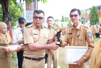 BugisPos, Bulukumba,- Bupati Bulukumba Andi Muchtar Ali Yusuf di sela Apel Gabungan OPD menyerahkan Piala dan Piagam kepada 12 kepala sekolah yang menerima penghargaan Adiwiyata Tahun 2025, di halaman Kantor Bupati Bulukumba, Senin 15 Desember 2025.