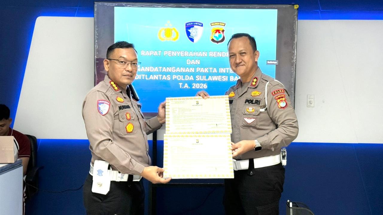 Bugispos.com, Sulbar – Sulbar – Direktur Lalu Lintas Polda Sulbar Kombes Pol Nurhadi Ismanto dalam rapat penyerahan Rendisgar dan penandatangan pakta integritas bagi seluruh Subdit jajaran Direktorat Lalu Lintas (Ditlantas) Polda Sulbar menekankan pentingnya pengelolaan anggaran yang bertanggung jawab, Jumat (9/1/26) di Aula Kantor BPKB.