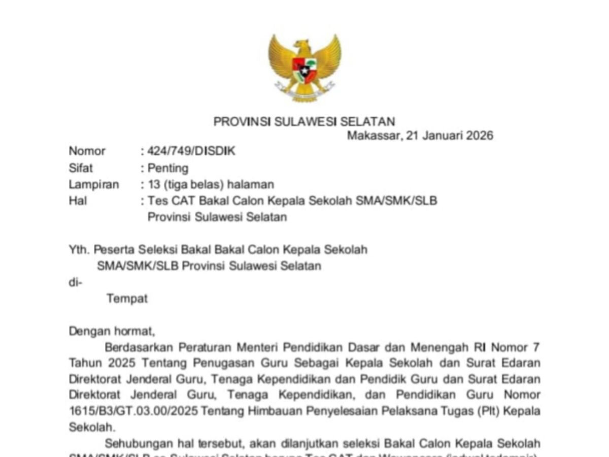 BugisPos, Makassar — Pemerintah Provinsi (Pemprov) Sulawesi Selatan melanjutkan proses seleksi Bakal Calon Kepala Sekolah (BCKS).