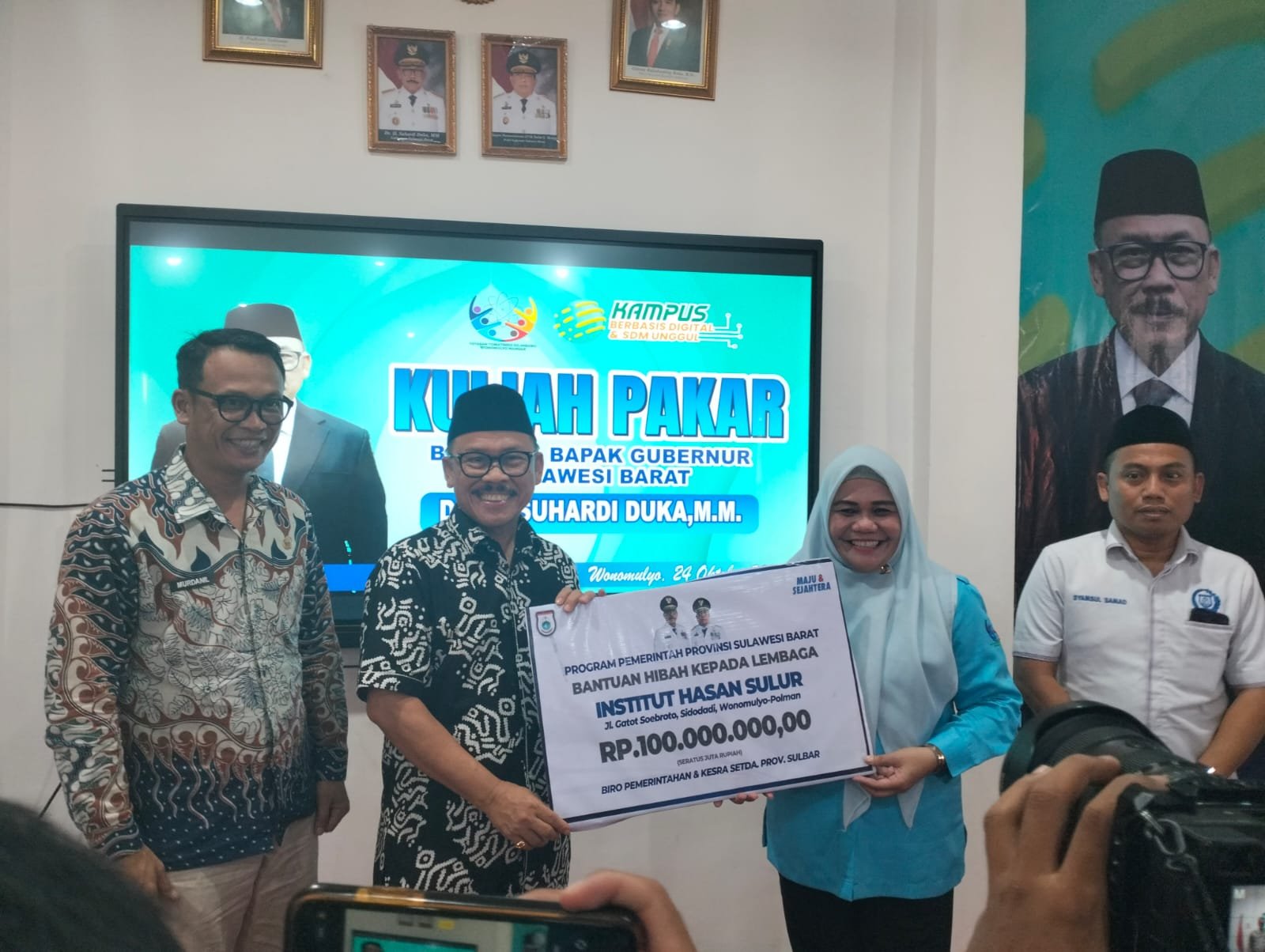 Bugispos.com, Sulbar – Gubernur Provinsi Sulawesi Barat, Suhardi Duka (SDK), menyerahkan bantuan dana hibah sebesar Rp100 juta kepada Institut Hasan Sulur (IHS), Jumat (24/10/2025).