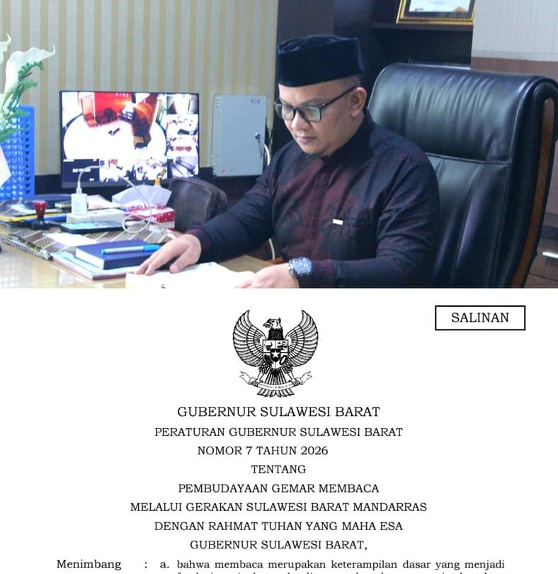 Bugispos, Mamuju – Pemerintah Provinsi Sulawesi Barat (Pemprov Sulbar) resmi menetapkan Peraturan Gubernur Sulawesi Barat Nomor 7 Tahun 2026 tentang Pembudayaan Gemar Membaca melalui Gerakan Sulawesi Barat Mandarras sebagai langkah strategis dalam meningkatkan kualitas sumber daya manusia dan memperkuat budaya literasi di daerah. Peraturan ini ditetapkan oleh Gubernur Sulbar Suhardi Duka (SDK) pada 10 Maret 2026 di Mamuju.