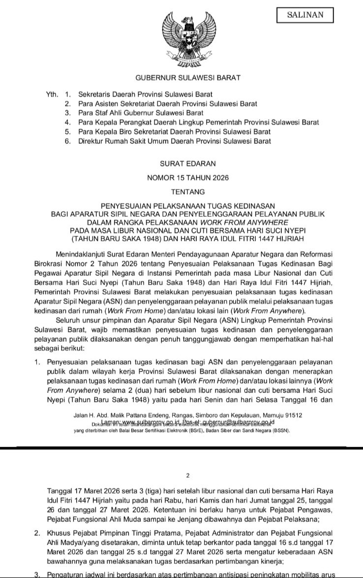 Dalam surat edaran tersebut dijelaskan bahwa pelaksanaan WFH dan WFA bagi ASN lingkup Pemerintah Provinsi Sulawesi Barat diterapkan selama dua hari sebelum libur nasional Nyepi, yakni pada 16 dan 17 Maret 2026, serta tiga hari setelah libur Idul Fitri, yaitu 25, 26, dan 27 Maret 2026.