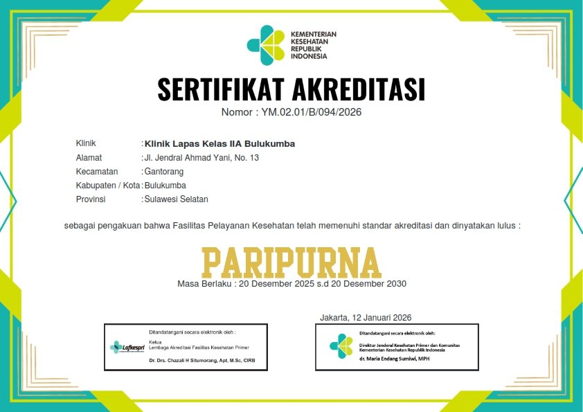 Sertifikat ini diserahkan lWakil Bupati Bulukumba, H. Andi Edy Manaf, sebagai bukti nyata bahwa kualitas layanan kesehatan bagi warga binaan kami telah diakui secara nasional.