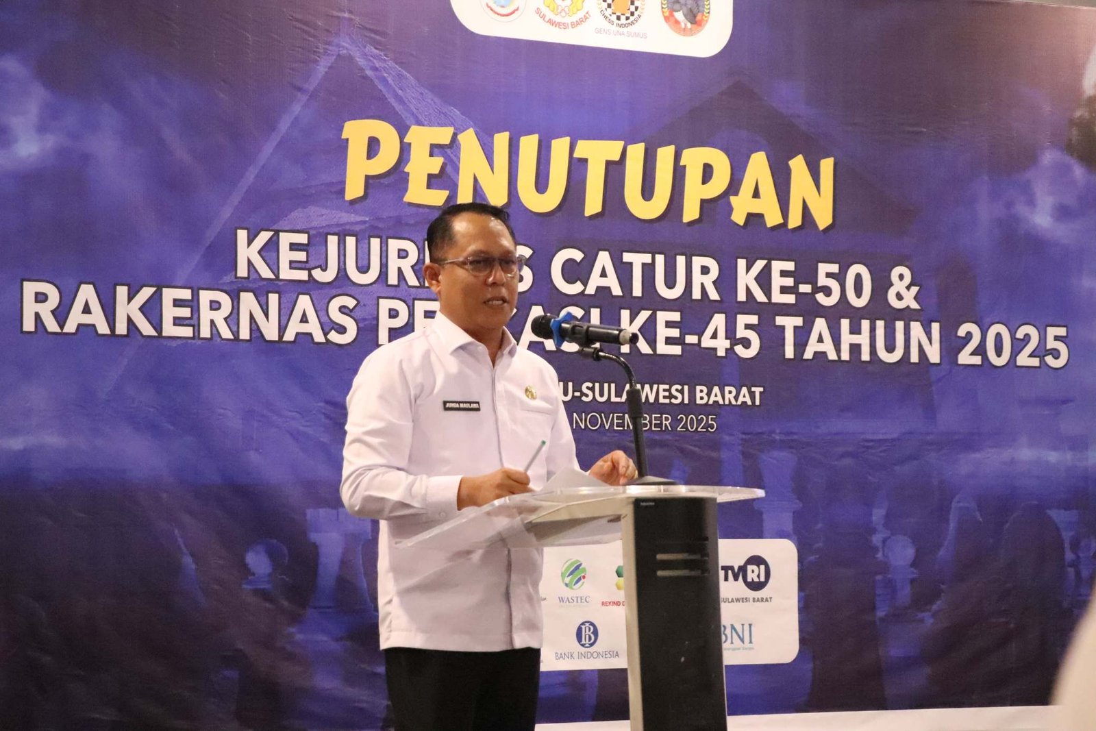 Bugispos.com, Sulbar – Sekprov Sulbar, Junda Maulana secara resmi menutup Kejuaraan Nasional (Kejurnas) Catur ke-50 dan Rapat Kerja Nasional (Rakernas) Percasi ke-45 tahun 2025 di Ballroom Hotel Maleo Town Square (Matos) Mamuju, Rabu 12 November 2025.