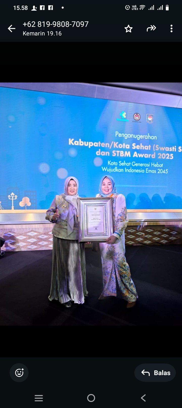 Penghargaan diserahkan dalam acara Penganugerahan Kabupaten/Kota Sehat dan STBM Tahun 2025 yang digelar Kementerian Kesehatan di Auditorium Siwabessy Kementerian Kesehatan, Jakarta Selatan, Jumat (28/11/2025).