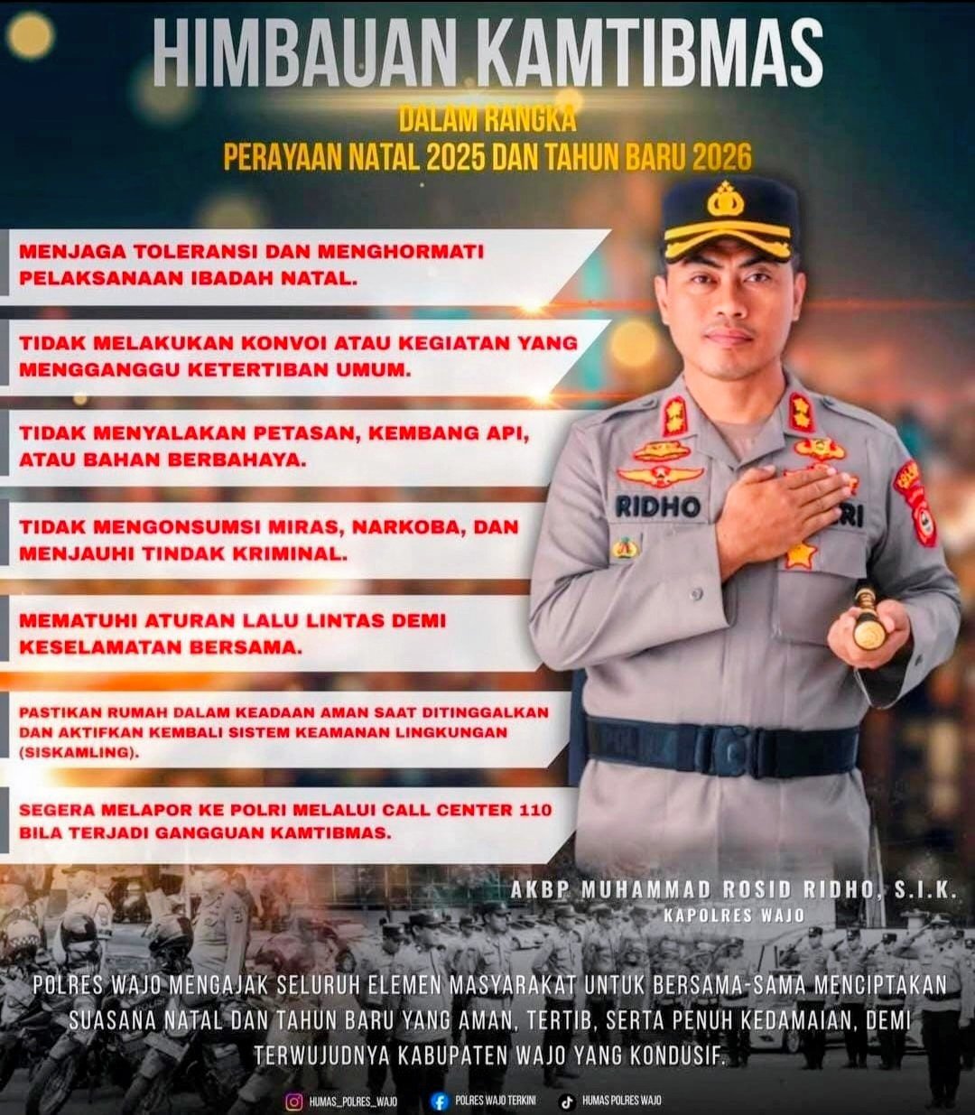 BugisPos, Wajo —Menjelang perayaan Natal 2025 dan Tahun Baru 2026, Kapolres Wajo AKBP Muhammad Rosid Ridho, S.I.K., mengeluarkan himbauan kamtibmas kepada seluruh lapisan masyarakat agar bersama-sama menjaga situasi keamanan dan ketertiban di wilayah Kabupaten Wajo tetap aman dan kondusif. Senin (29/12/2025).