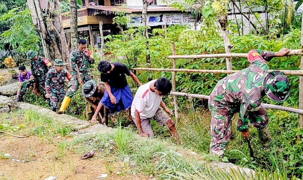 Kegiatan yang dipimpin oleh Peltu Jamaluddin tersebut melibatkan personel Koramil dan warga setempat sebagai upaya meningkatkan kepedulian terhadap kebersihan lingkungan sekaligus memperbaiki sistem drainase desa.