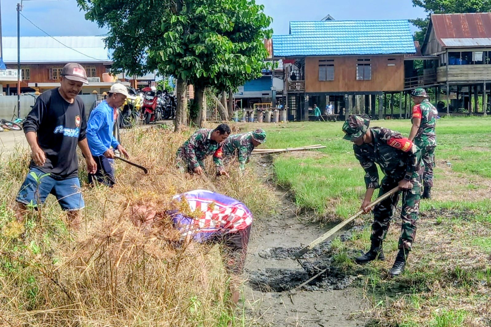 Dalam kegiatan tersebut, personel Koramil bersama warga bergotong royong mengangkat sampah, membersihkan endapan lumpur, serta merapikan saluran air agar kembali lancar.