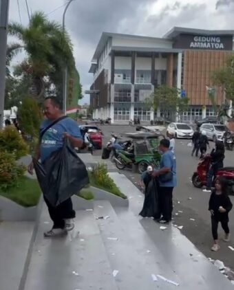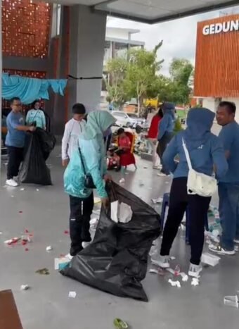Sebagian terlihat menyapu, memungut sampah, dan mengangkat meja, sementara lainnya mengumpulkan sampah ke dalam kantong plastik besar. Suasana penuh kekompakan dan tanggung jawab itu membuat area yang semula dipenuhi sampah kembali bersih dan rapi dalam waktu singkat.