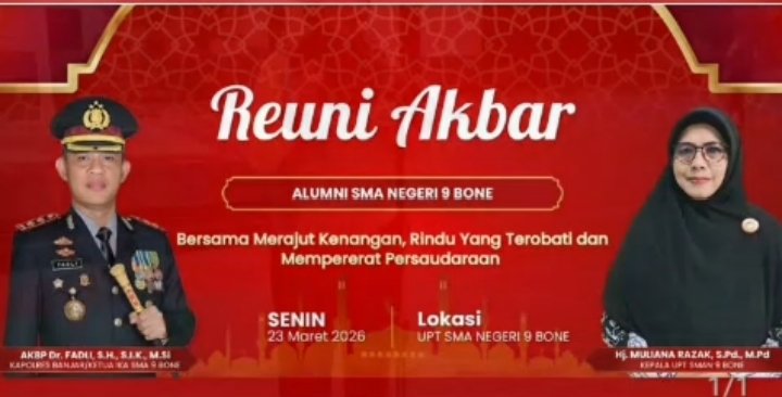 BugisPos,Bone — Alumni SMA Negeri 9 Bone akan menggelar Reuni Akbar esok hari Senin 23 Maret 2026, kegiatan ini sedianya akan diikuti oleh seluruh angkatan mulai Alumni tahun 1994 yang merupakan angkatan pertama sampai Alumni tahun 2024 akan hadir dalam acara tersebut.