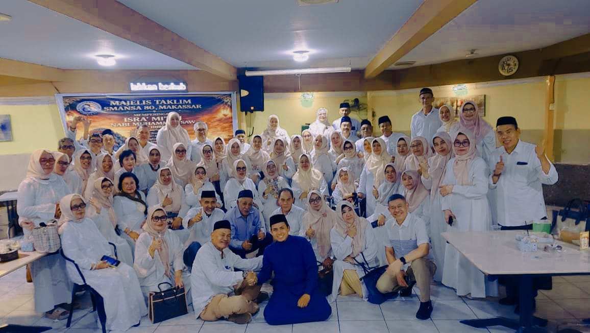 BugisPos, Makassar — Dari RM Lorong Ta Makassar, Sabtu (17/01/26), Majelis Taklim Ika Smansa Makassar Angkatan 80 menyelenggarakan peringatan Isra’ Mi’raj Nabi Muhammad SAW 1447 H tahun 2026 dengan tema: MENELUSURI JEJAK ISRA’ MI”RAJ NABI MUHAMMAD SAW UNTUK MENINGKATKAN IMAN DAN KETAKWAAN KEPADA ALLAH SWT.