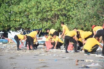Dengan mengenakan seragam olahraga warna kuning, para Polisi membersihkan sampah dan limbah plastik di sepanjang pesisir pantai. Sehingga pantai kembali terlihat bersih.