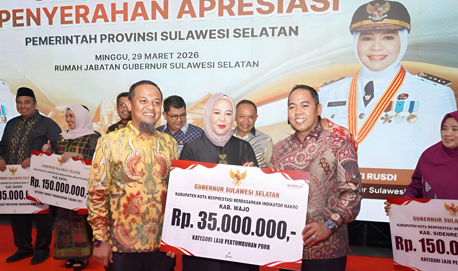 WAJO, BUGISPOS.com – Pemerintah Kabupaten (Pemkab) Wajo kembali menorehkan prestasi dengan meraih apresiasi dari Pemerintah Provinsi Sulawesi Selatan. Penghargaan tersebut diberikan dalam kegiatan silaturahmi yang digelar Gubernur Sulawesi Selatan, Andi Sudirman Sulaiman, di Lapangan Upacara Rumah Jabatan Gubernur Sulsel, Jalan Sungai Tangka, Makassar, Minggu (29/3/2026) malam.
