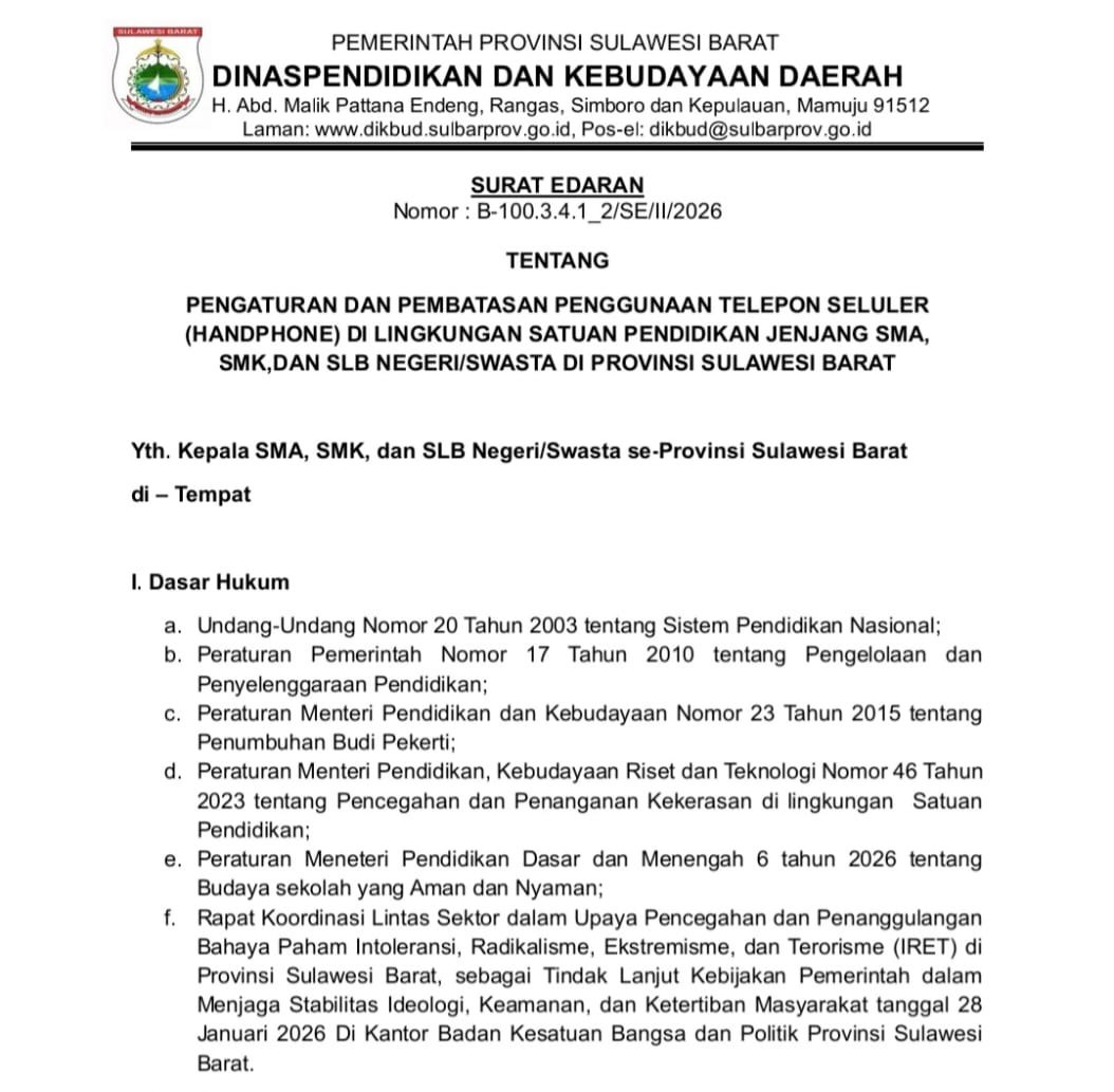 Surat edaran ini ditetapkan di Mamuju pada 12 Februari 2026 dan ditandatangani oleh Kepala Dinas Pendidikan dan Kebudayaan Provinsi Sulawesi Barat. (*)