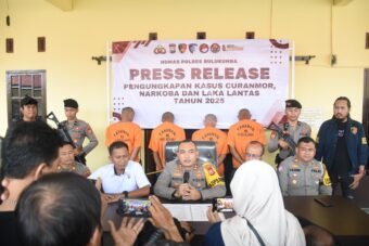 BUGISPOS, BULUKUMBA — Polres Bulukumba menggelar Press Release Akhir Tahun 2025 dipimpin Kapolres Bulukumba AKBP Restu Wijayanto, S.I.K, di depan ruang gelar Sat Reskrim Polres Bulukumba, Selasa (30/12/2025).