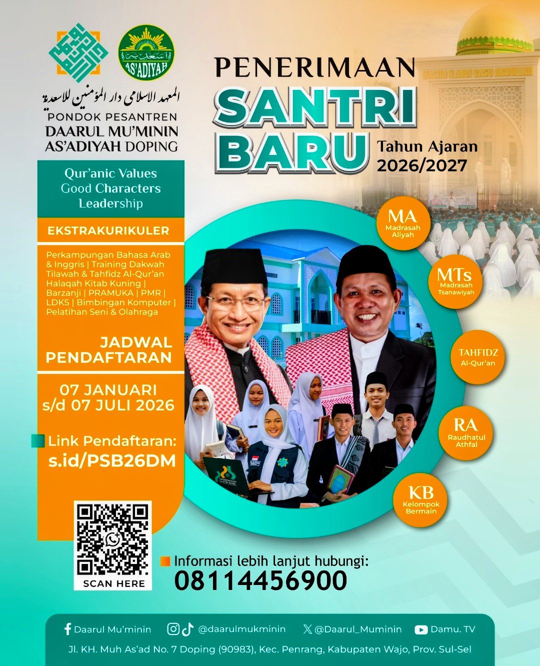 Pimpinan Pondok Pesantren Daarul Mu’minin As’adiyah Doping, H. Agustan Ranreng, mengatakan pendaftaran santri baru telah dibuka sejak 7 Januari dan akan berlangsung hingga 7 Juli 2026.