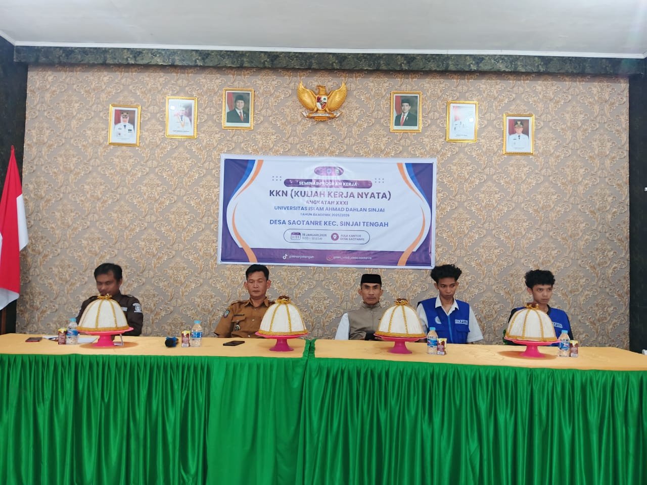 BugisPos, Sinjai – Mahasiswa Kuliah Kerja Nyata (KKN) Angkatan XXXI Universitas Islam Ahmad Dahlan (UIAD) Sinjai melaksanakan Seminar Program Kerja di Aula Kantor Desa Saotanre, Kecamatan Sinjai Tengah, Kabupaten Sinjai. Senin (19/1/2026).