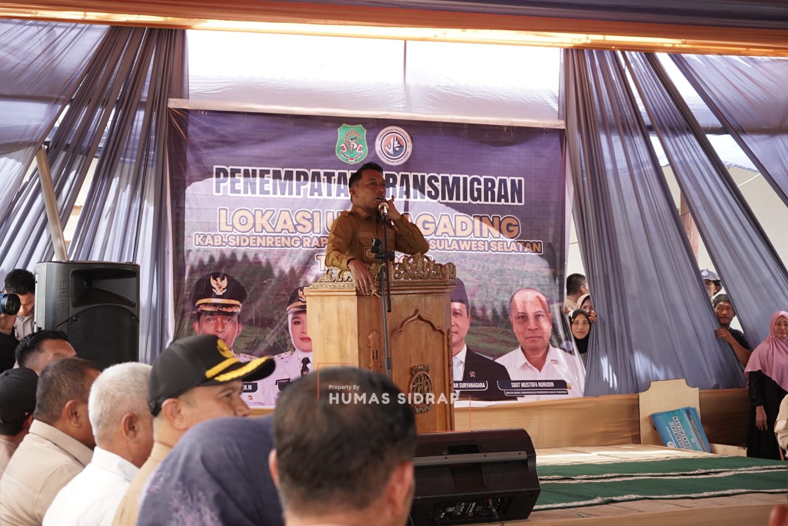 Dalam sambutannya, Bupati Syaharuddin menyampaikan ucapan selamat datang kepada seluruh transmigran dan memperkenalkan nilai kearifan lokal Sidrap, “Saromase” (cinta dan kasih sayang) serta “Alako” (ambillah), sebagai simbol keramahan dan kedermawanan masyarakat.