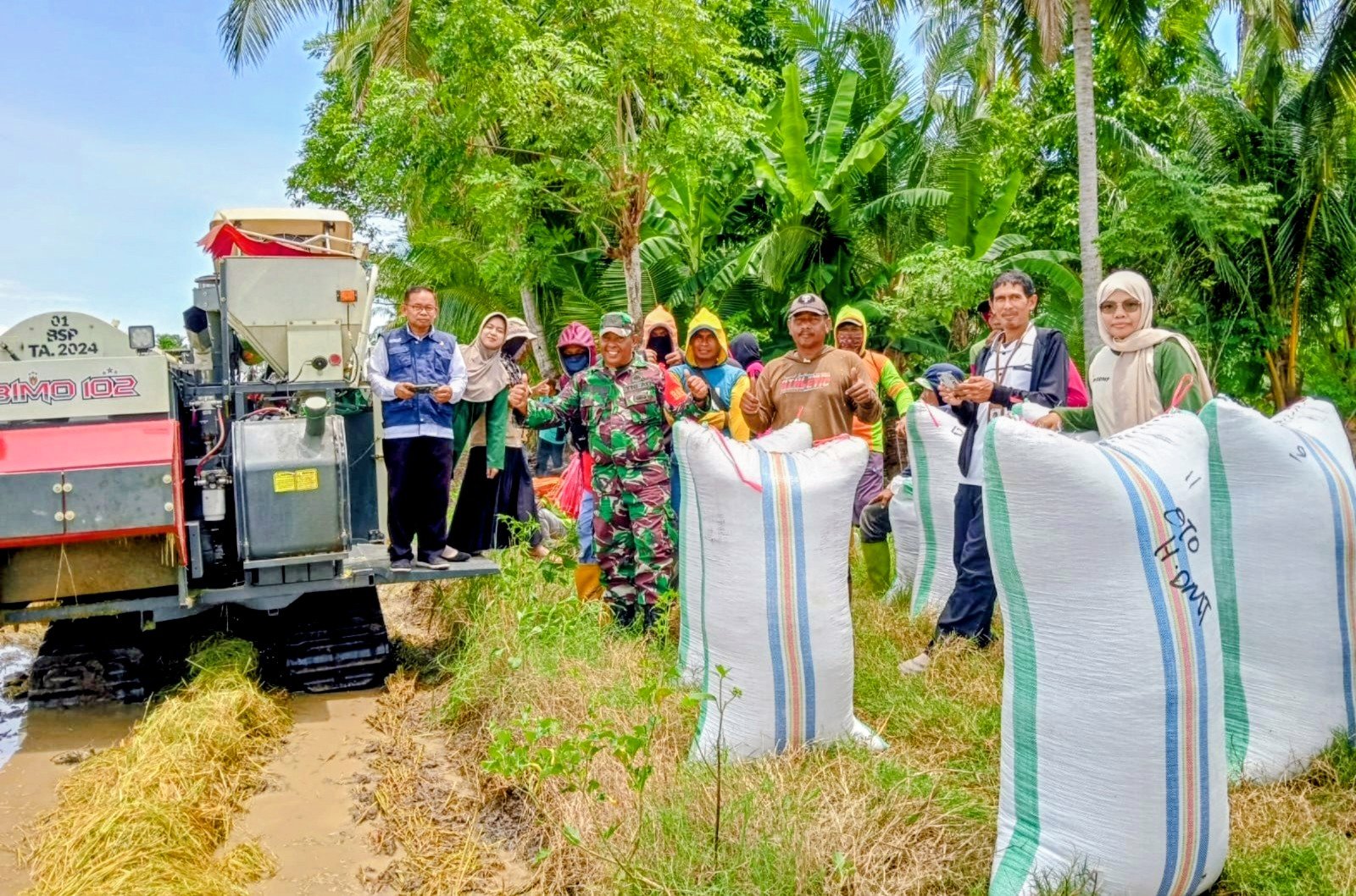 Serma Hairuddin tidak hanya menyapa, tetapi turun langsung ke pematang sawah, memotong padi, mengumpulkan ikatan gabah, dan sesekali mengajak warga berbincang ringan. Kehadirannya menjadi penyemangat bagi para petani yang sejak pagi sudah berkeringat.