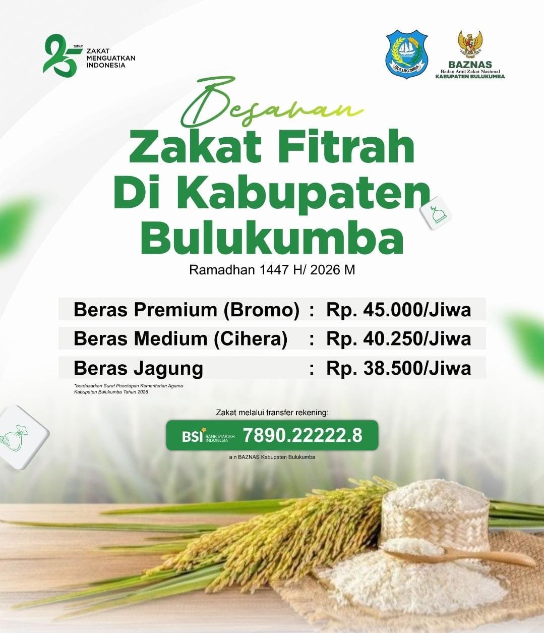 Menjelang hari raya Idul Fitri 1447 Hijriah, besaran zakat fitrah di wilayah Bulukumba, Sulawesi Selatan, resmi ditetapkan pemerintah, sebagaimana diumumkan oleh Kementerian Agama Kabupaten Bulukumba melalui Surat Nomor B-52/Kk.21.04/7/BA.03.2/02/2026 tertanggal 13 Februari 2026.