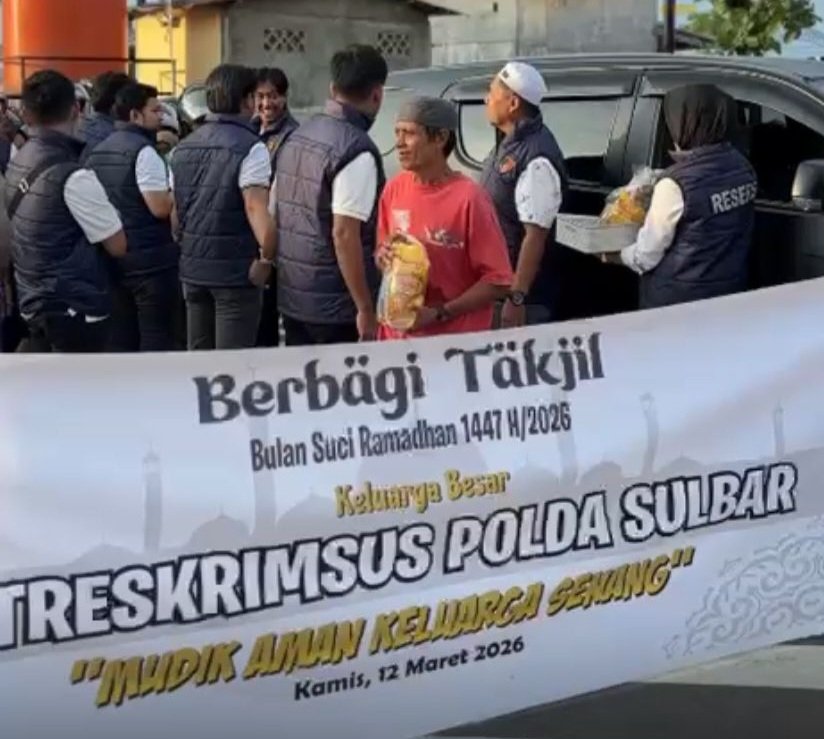 Bugispos, Sulbar – Dalam suasana penuh kehangatan bulan Ramadan, Direktorat Kriminal Khusus (Ditkrimsus) Polda Sulawesi Barat menyelenggarakan kegiatan bagi-bagi takjil dan parcel sembako di pertigaan depan Masjid Al-Quba, dekat Pelabuhan Mamuju, Kamis (12/3/26).